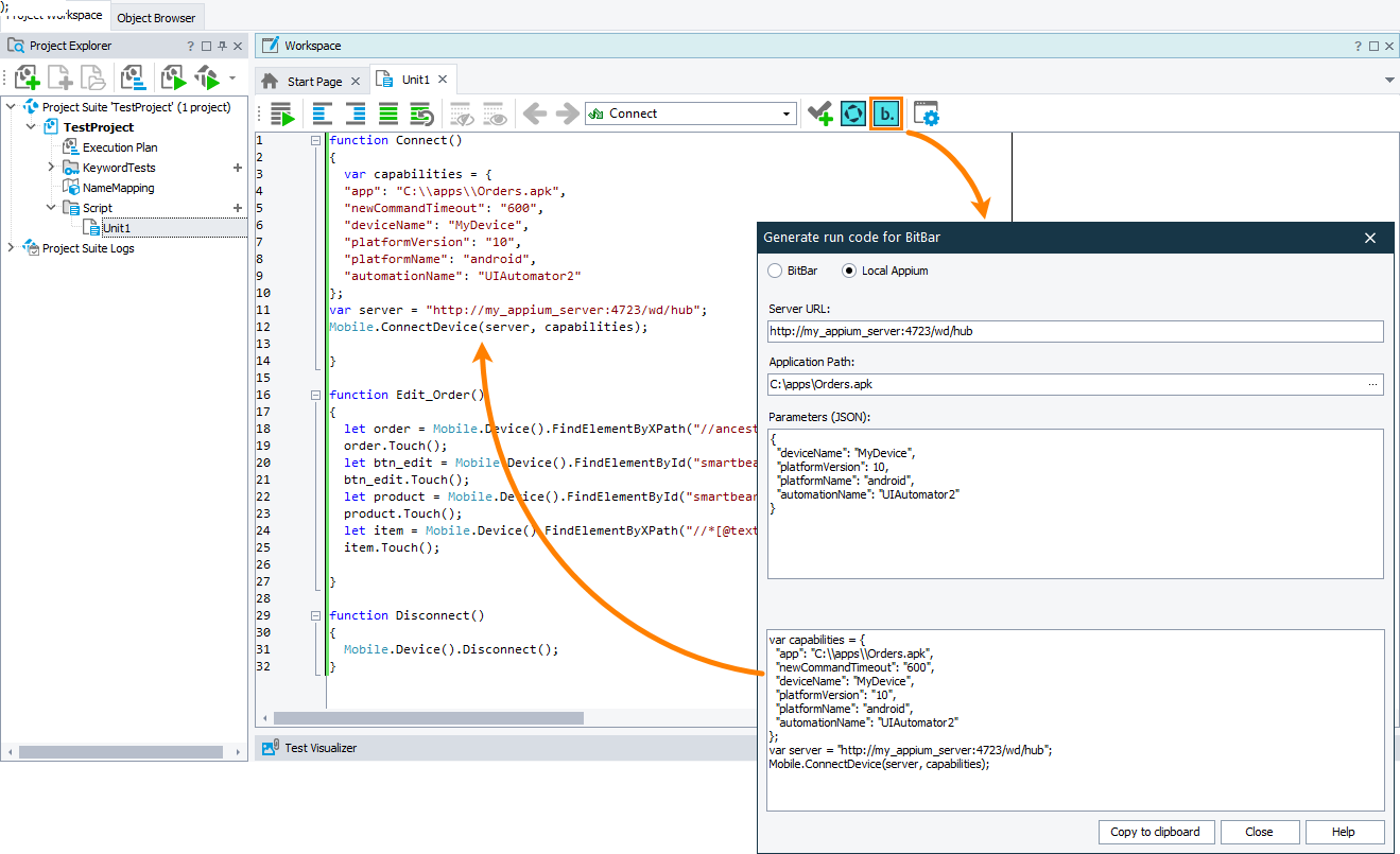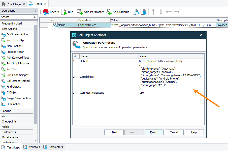 Currently, TestComplete does not have operations for working with the BitBar device cloud. However, you can connect to the cloud and start the session in it by calling the code described above by using the Run Code Snippet, Call Object Method, or Run Script Routine operation. For example: