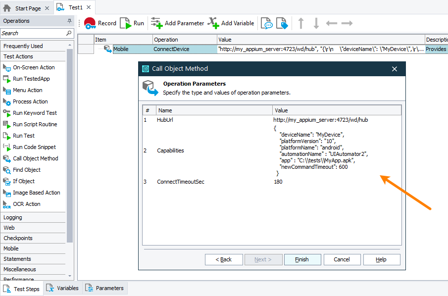 Currently, TestComplete does not have operations for working with the mobile device clouds. However, you can connect to the server and start the session by calling the code described above by using the Run Code Snippet, Call Object Method, or Run Script Routine operation. For example: