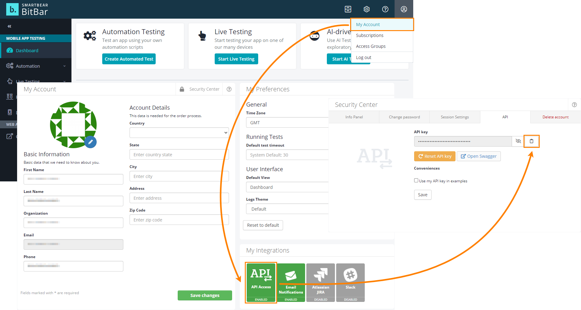 If the current TestComplete project does not have a BitBar API key specified, to connect to the BitBar device cloud dialog, enter the API key.