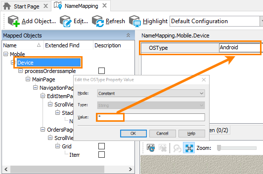 • For platform-independent tests that can run both on iOS and on Android devices, change the default mapping criteria for devices. In Name Mapping, replace the value of the OSType property (iOS or Android) with an asterisk (*).