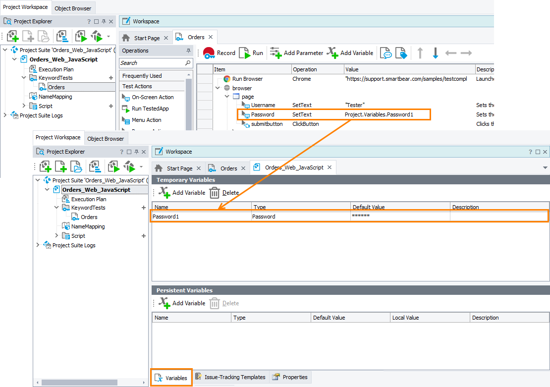 Password variables are created by using the SetText operation or method for keyword and script tests respectively: