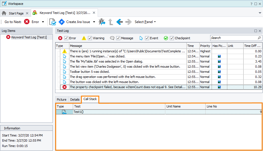 In TestComplete, tests can run each other. For example, a keyword test may run a script routine or another keyword test. Each of these tests can post messages to the test log. The Call Stack panel of the test log displays the sequence of keyword tests and script routines (call stack) that led to posting a message to the log. This information helps you better understand what happened in your project during the test run (see Collecting Call Stack Information for Log Messages).