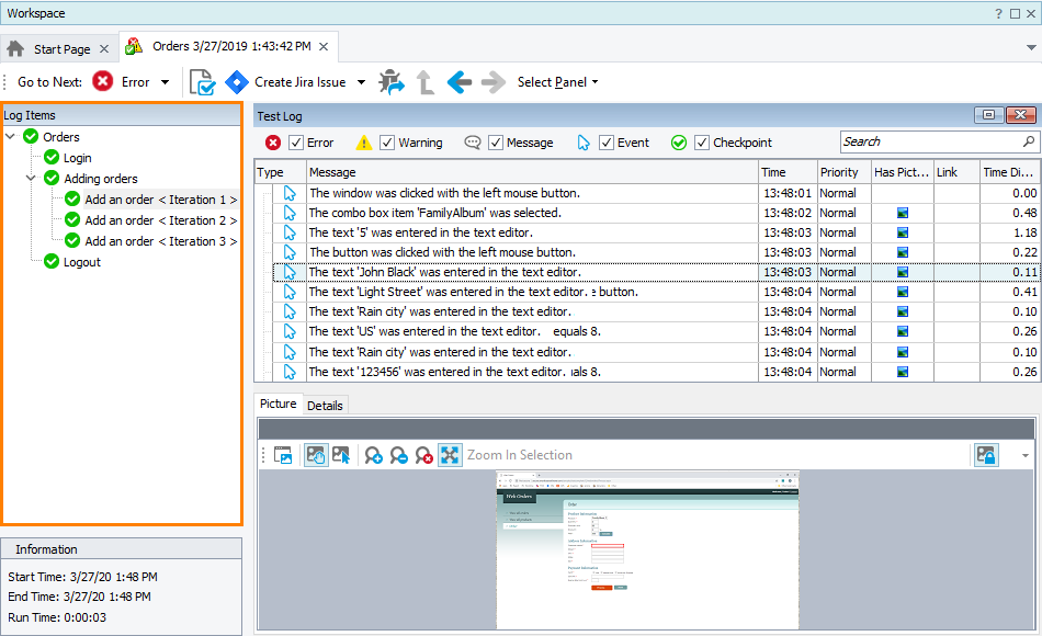 The Log Items panel of the test log displays a tree-like structure of test results. Test results are organized by projects and tests items (these can be keyword tests, script routines and so on); the log item names indicate the project elements that were run. When you select an item in the log tree, the panel on the right displays the results the item contains.