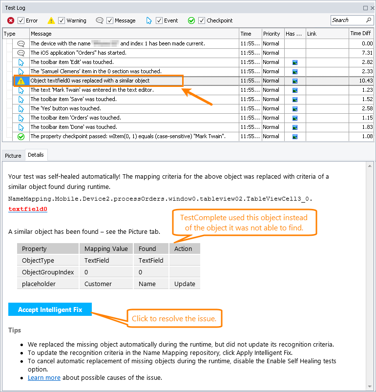 If the tested application has changed and the identification properties that your test uses to find tested objects are no longer valid, TestComplete will try to detect the changes to find the missing objects. If your test log reports the “Object <Object_Name> was replaced with a similar object” warning, this means that TestComplete was not able to find the needed tested object during the test run and used a similar object instead.