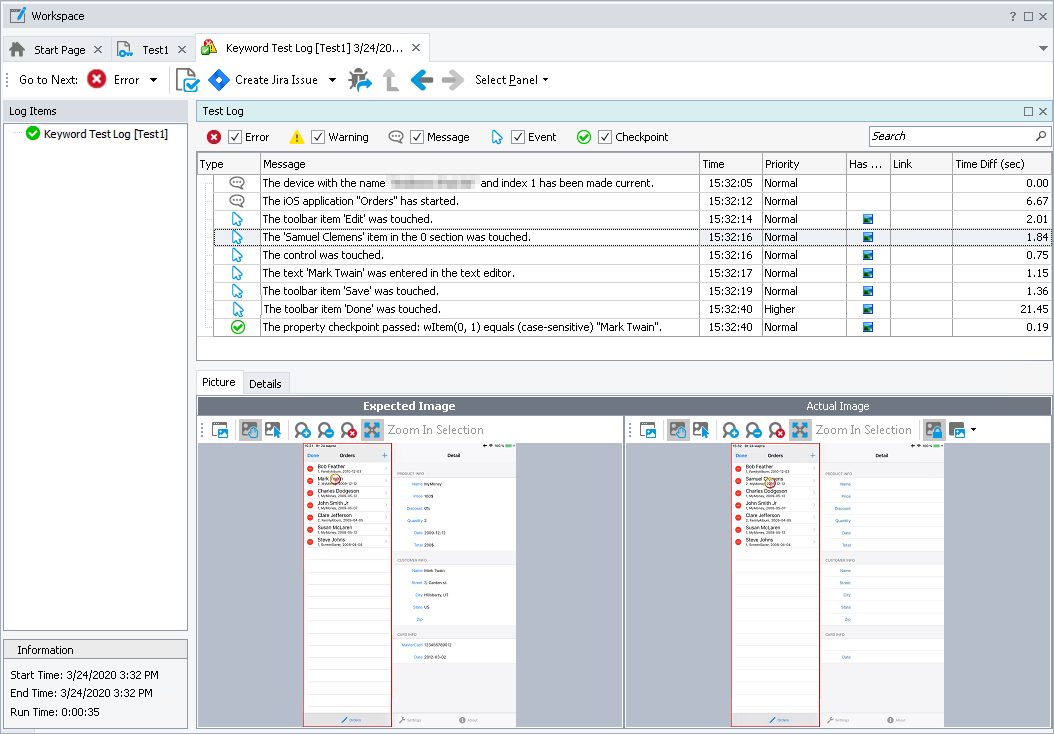 The Picture panel contains images that show the expected and the actual application states before the selected test command is executed (“Expected” is the image that was captured for the command during test recording, and “Actual” is the image that was captured during the test run.) The Actual Image toolbar has a special button that lets you highlight the difference between the images (if any). The images help you understand what happened in the application during the run, view the differences, and find errors faster. For more information on capturing images, see the topics of the Test Visualizer section.