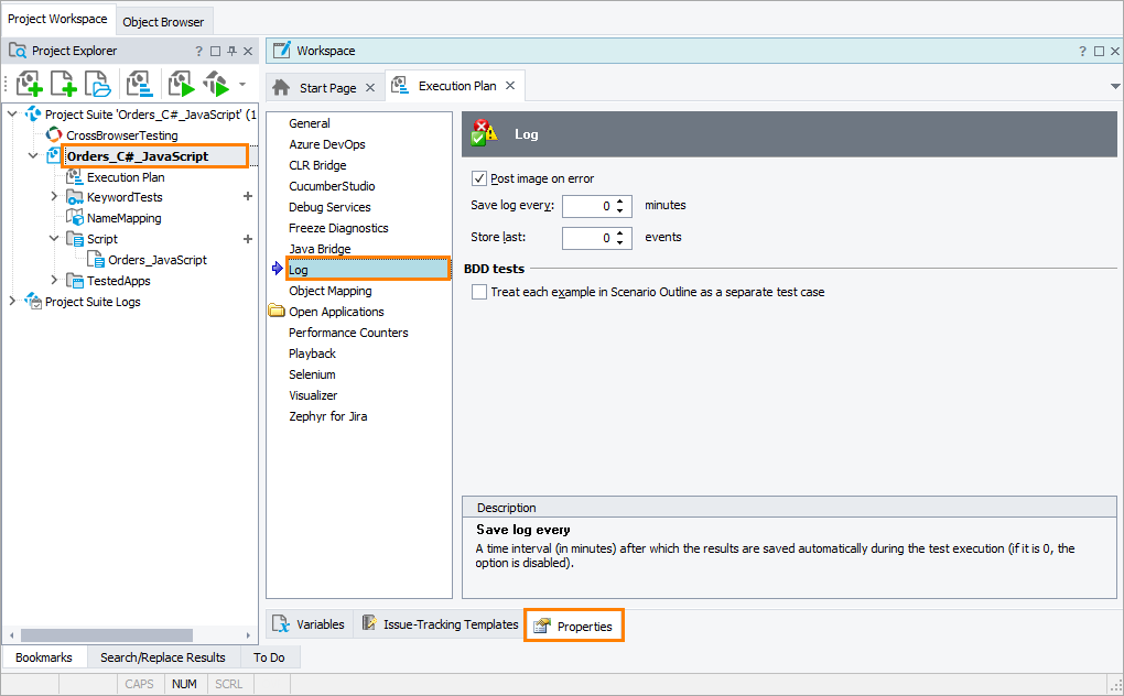 The Log options specify how the test engine will store log messages and post images for errors. Also, these project settings affect how the test engine will report the BDD test results.
