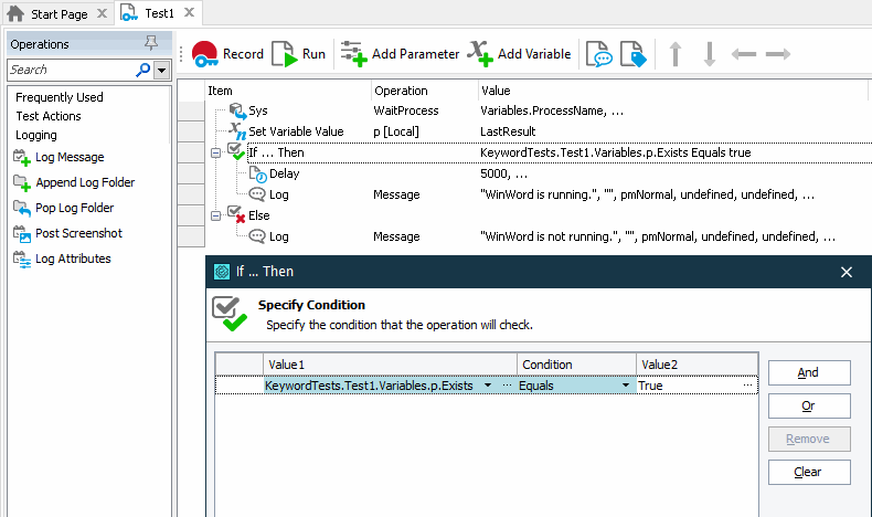 • To check the variable’s value, append the If ... Then operation to the test. TestComplete will display the Operation Parameters dialog where you can specify the condition to be checked.