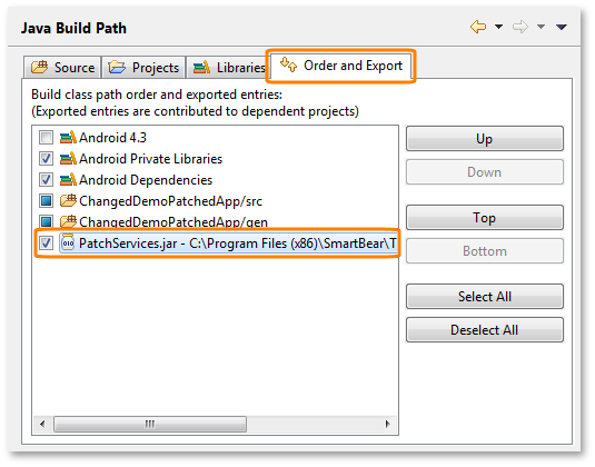 Important: Open the Order and Export tabbed page and select PatchServices.jar from the list: