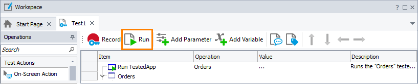 Before running a recorded test, make sure it starts with the same initial conditions as the recording did. For instance, the test almost always requires the tested application to be running. So, before simulating the user actions, you should launch the application. In our case, to launch our tested application, we use the Run TestedApp operation at the beginning of the test, so the test will launch it for us. Alternatively, you can run the tested application manually from the TestComplete IDE.