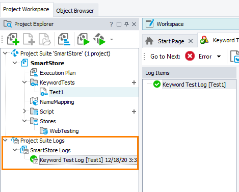 TestComplete keeps a complete log of all operations performed during testing. The Project Explorer keeps the test results under the Project Suite Logs > SmartStore Log node. This is where you are viewing the test history of the project and project suite. Each node corresponds to a test run. An icon to the left of the node shows whether the corresponding test run passed successfully: