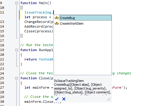 Templates you create in the Template editor will appear in the Code Completion window as a method of the IssueTracking object; template fields are shown as method parameters: