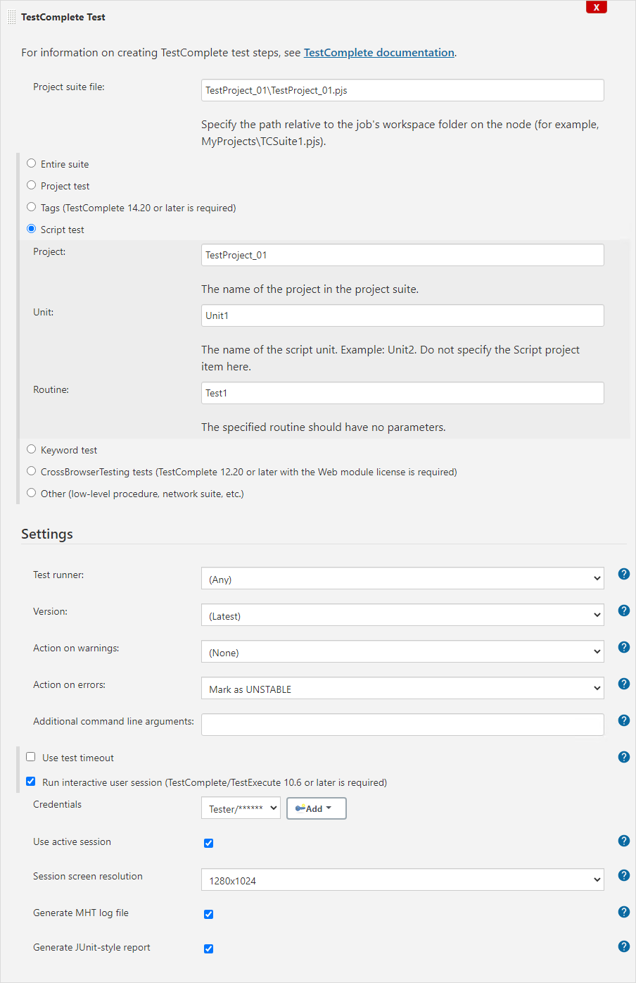 Generate MHT log file - If this option is enabled, TestComplete exports test results to a .mht file after the build is over. You can download this file from the Jenkins page displaying test results.