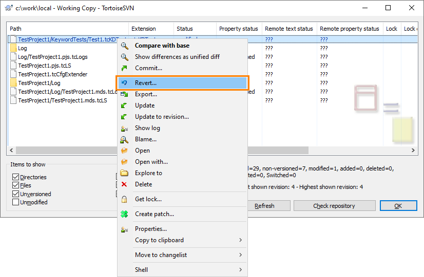 If you use the TortoiseSVN client to work with Subversion from TestComplete, TestComplete will open the Revert dialog: