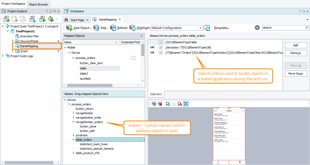 You may find that the unique identifier that the Object Browser or Object Spy generates for test objects may be too long and not convenient to use in tests. Instead, you can assign custom names to tested objects. This is called name mapping: TestComplete adds the object to the Name Mapping repository, assigns a meaningful name — alias — to the object and search criteria that will be used to locate the object in the tested application during the test run: