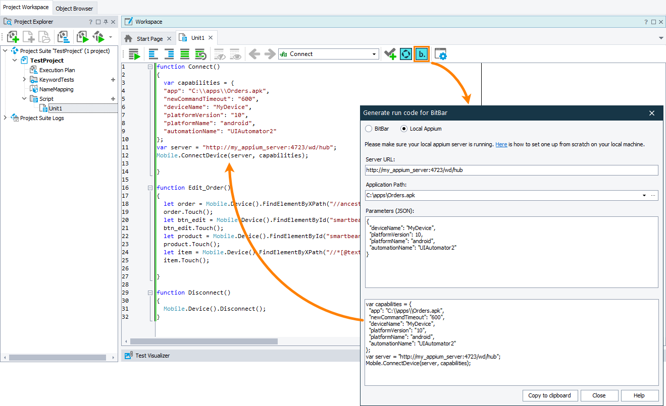 Write a script code that will connect to your private server managed by Appium and start a testing session there. You can write the code manually, or you can use the Generate Run Code dialog: