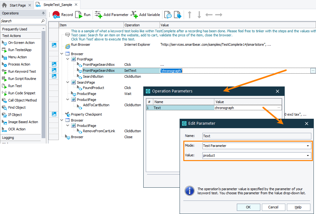 Now, when executing the operation, TestComplete will pass the value of the specified test parameter to the operation parameter.