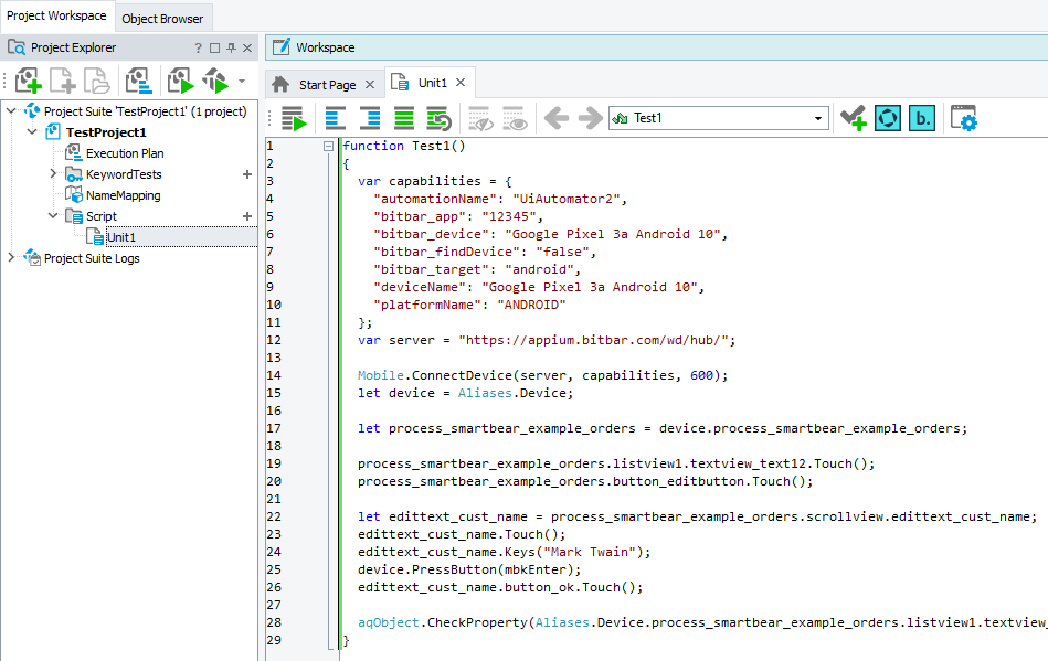 In TestComplete, you create automated tests for mobile applications running on devices managed by the BitBar mobile device cloud or by a private Appium server. The easiest way to create a test is to record it. You can also write script tests and create keyword tests manually from scratch or modify recorded tests.