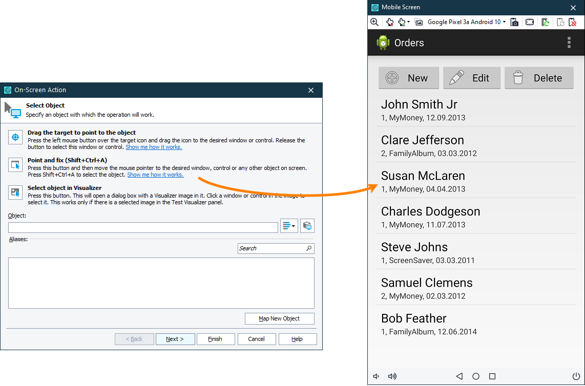 TestComplete will show a wizard asking you to specify the target test object. Specify the object by pointing it out in the Mobile Screen window: