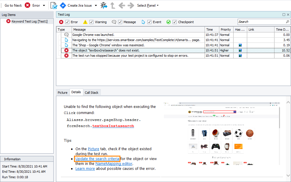 TestComplete may post additional text and images along with the message. To view them, select the desired message in the log and look in the Details and Picture panes that are below the message list.