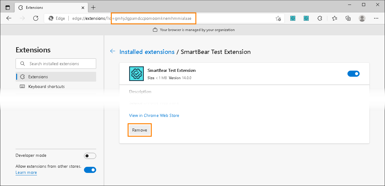 If the Edge web store is not available during the SmartBear Test extension installation, the extension will not be installed. When the test recording in Edge starts, TestComplete will suggest installing the extension it gets from the Chrome web store. If the Edge web store becomes available, the version of the extension from it will be installed as well. As a result, two versions of the extension will be added to Edge that can cause issues with creating and running tests.
