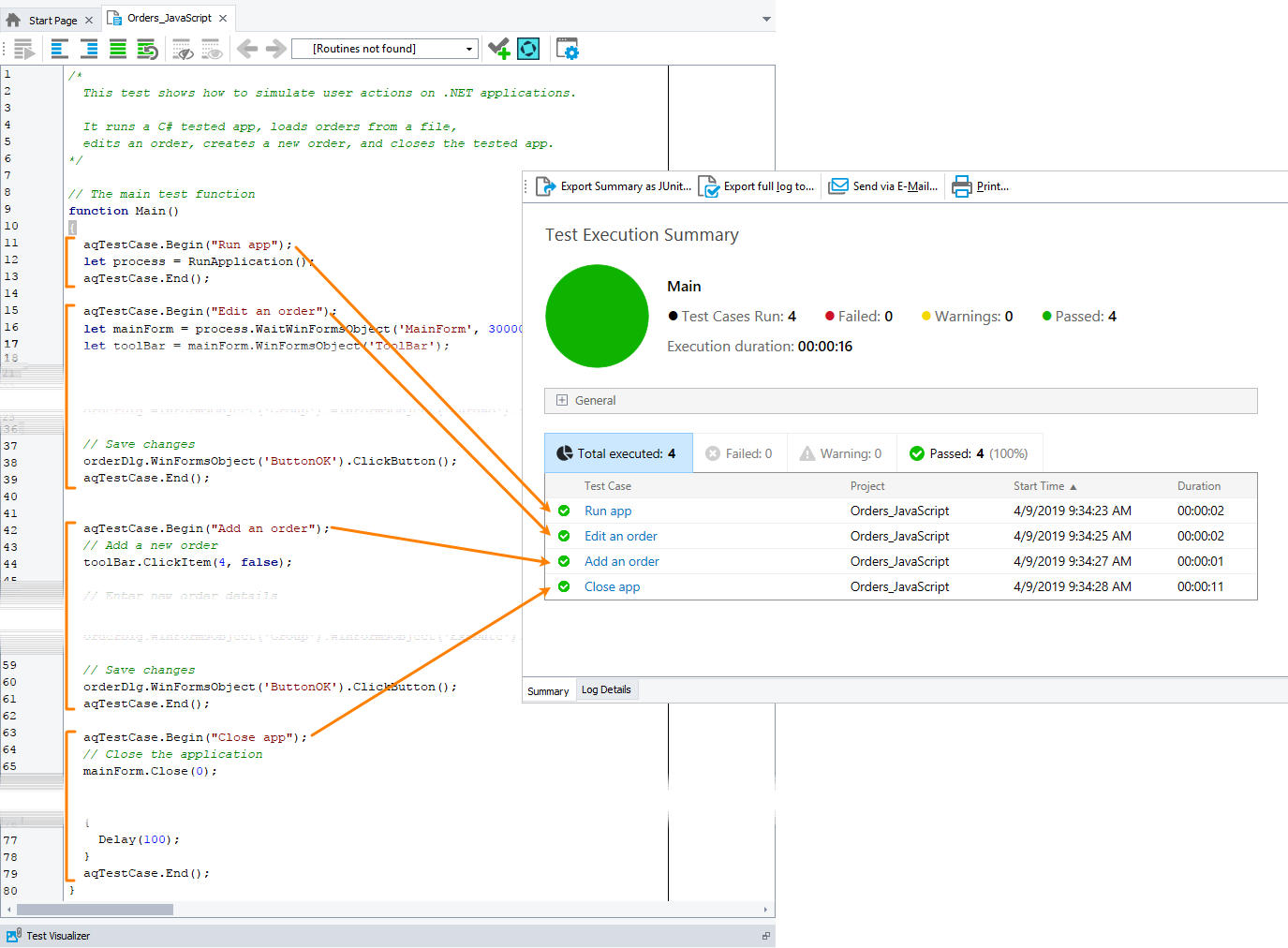 object allows marking arbitrary parts of your script code as test cases. These code parts will be treated as separate tests and will be included in the Summary report: