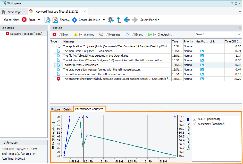 For more information on monitoring performance counters with TestComplete, see Monitoring Tested Application Performance.