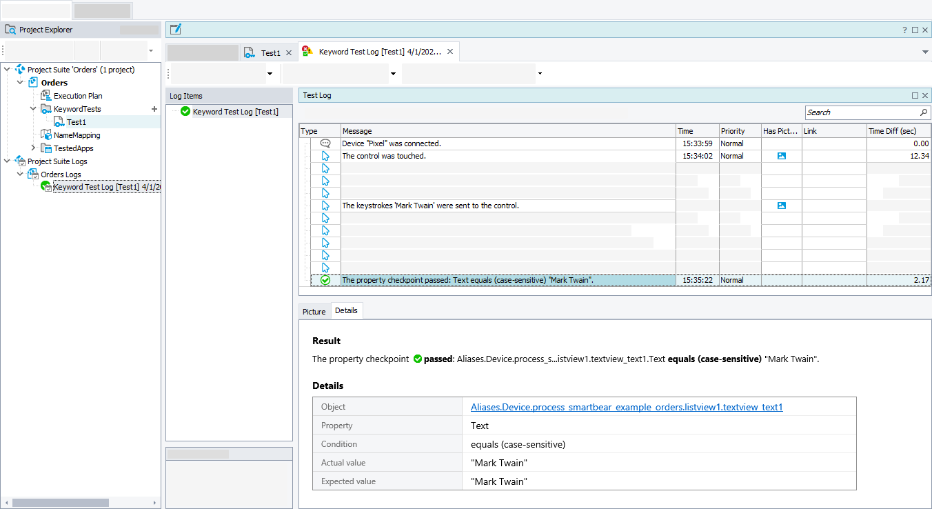 The Details panel contains details on the performed operation. For example, Details for property checkpoints includes the check type (equals, contains, matches a regular expression, and so on) and other details.
