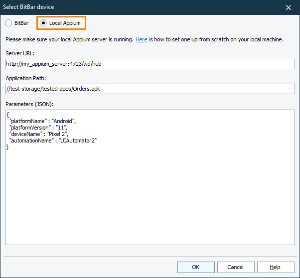 In the Application Path text box, specify the full path to the tested application (Orders.apk).