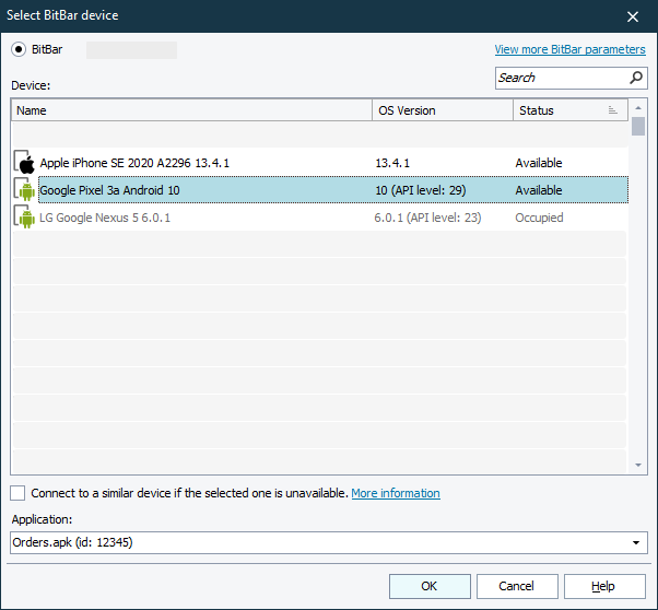 TestComplete shows the Select BitBar Device dialog. It lists all mobile devices that BitBar provides: