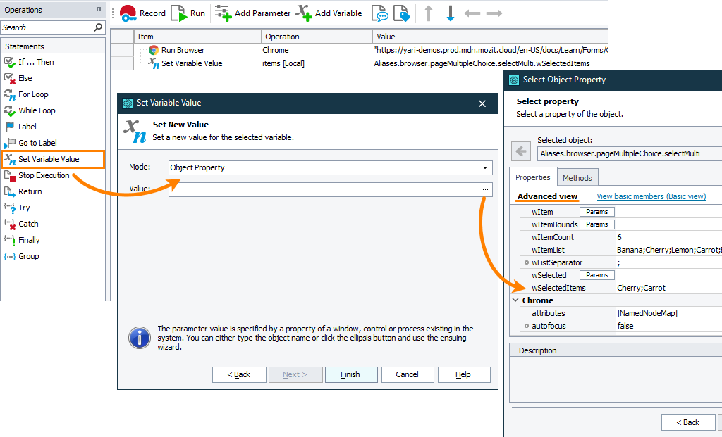 List box controls can support selecting several items at once. To get the list of all items selected in a list box, you can use the wSelectedItems property. It returns the captions of selected items separated by the delimiter character. To compare the list of selected items against an expected value, you can use property checkpoints. You can also store the list to a variable for later use or post it to the test log.