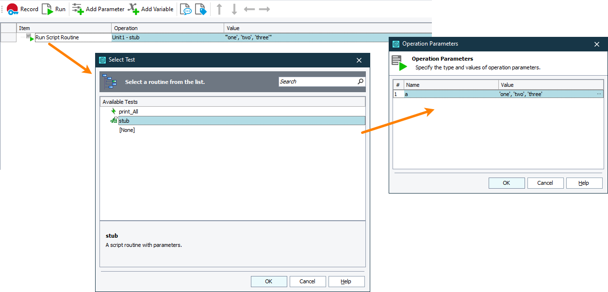 When you add the operation to a test, it shows the Select Test dialog, in which you can select the script routine to execute.