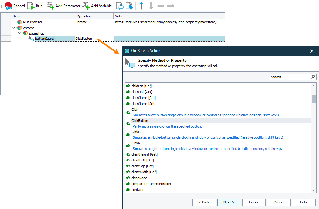 1. Add the On-Screen Action operation to your keyword test. TestComplete will show the Operation Parameters wizard.