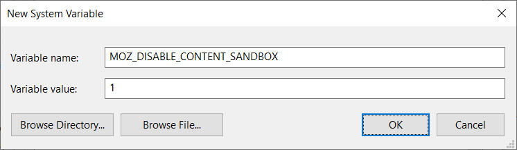 If you are facing an issue with TestComplete being not able to record user actions over web pages in Firefox or to access Page objects in this web browser, you may need to configure your system to disable sandbox in Firefox. To do this, create a MOZ_DISABLE_CONTENT_SANDBOX Windows environment variable and set its value to 1.