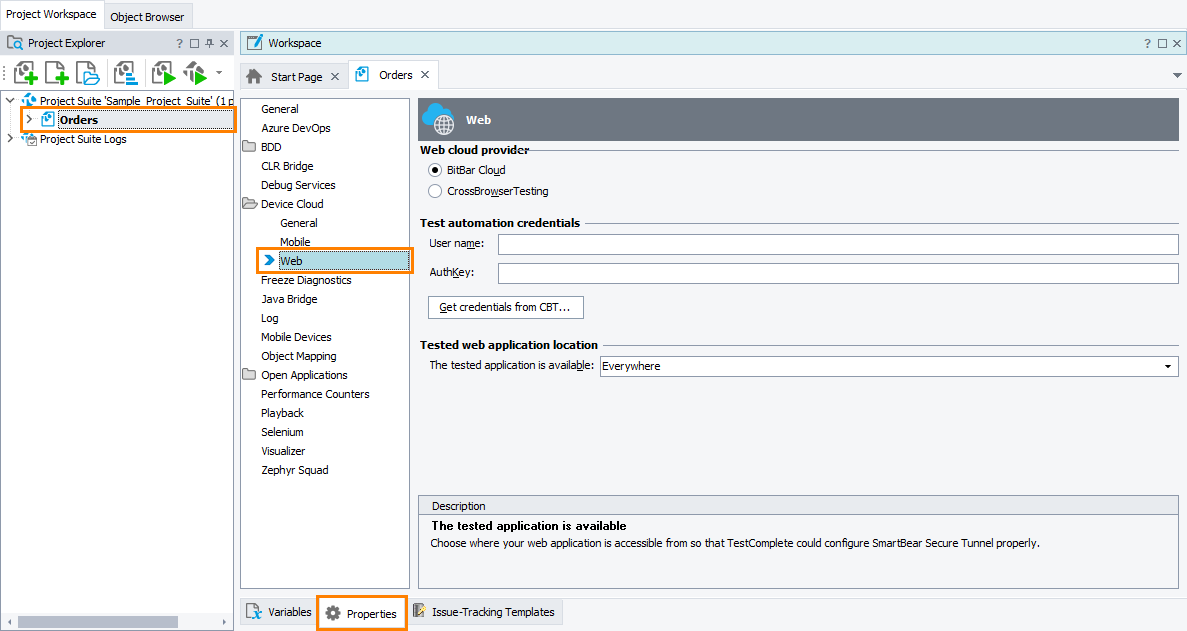The tested application is available - Specifies where your tested web application is located. Configure the property to command TestComplete to open a secure tunnel between your tested web application and your testing environment.
