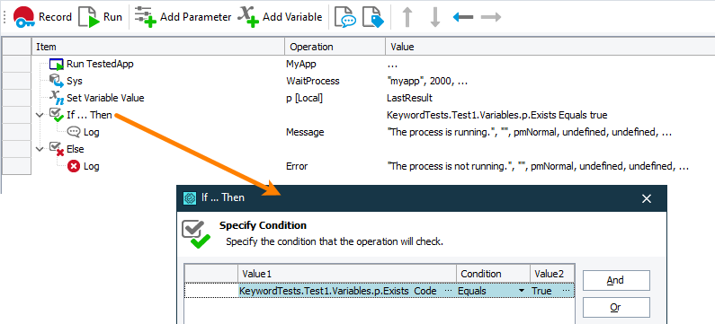 3. Add the If … Then operation to the keyword test and specify the condition to check: