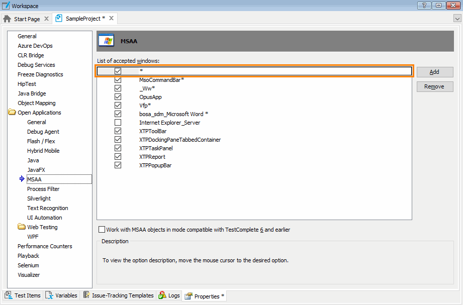 TestComplete will then use the MSAA engine to expose methods and properties of any existing window.