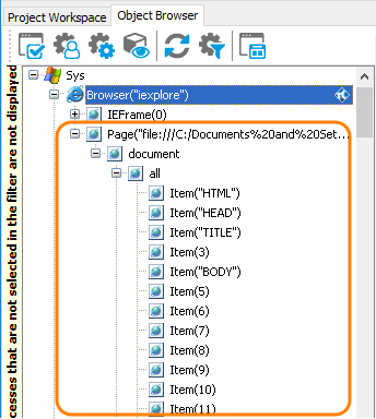 • Switch to the TestComplete Object Browser panel and explore the page contents.