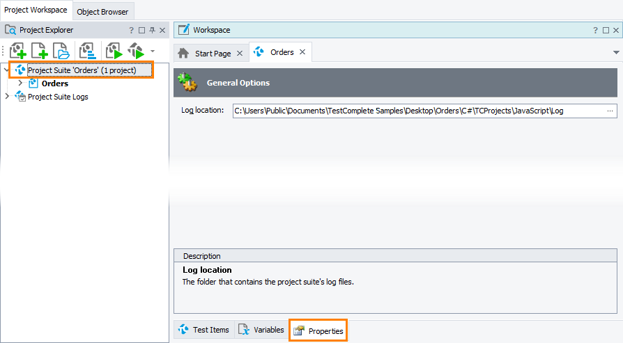 • Log location - Specifies the path to the folder that will hold log files for the given project suite. See Test Results. This path can be either relative, or absolute. If the path is relative, it will be combined with the path to the project suite file to obtain the target folder name. If the option holds an absolute path, it will be used as is. By default, the option holds the string Log. This is a relative path, so TestComplete will post the log files to the Log subfolder of the project suite folder.