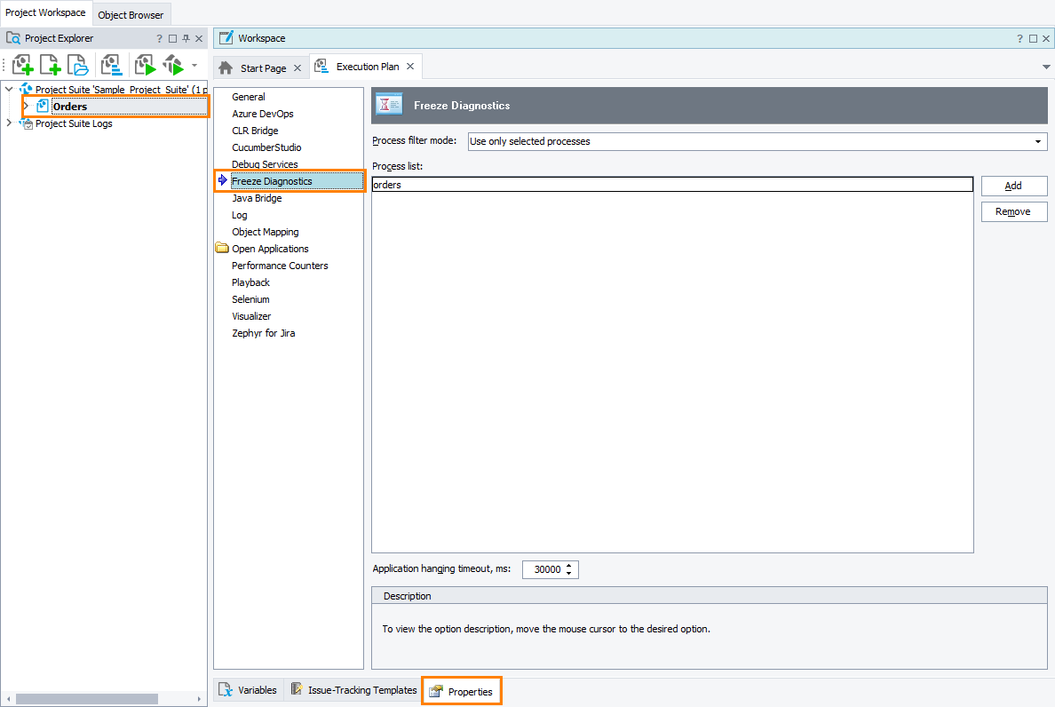 TestComplete Project Properties - Freeze Diagnostics