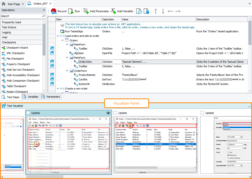 Test Visualizer captures screenshots for user actions (mouse clicks, keypresses, menu item selections and so on) during test recording or playback and associates the captured images with appropriate test commands. These images help you to understand what actions the test commands perform better.