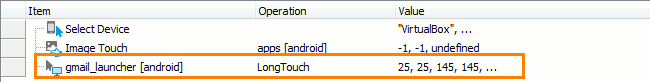 • Drag action - To simulate a drag action, that is, to drag one object from one point to another, call the LongTouch actions with the parameters that specify the starting point’s coordinates and the ending point’s coordinates.