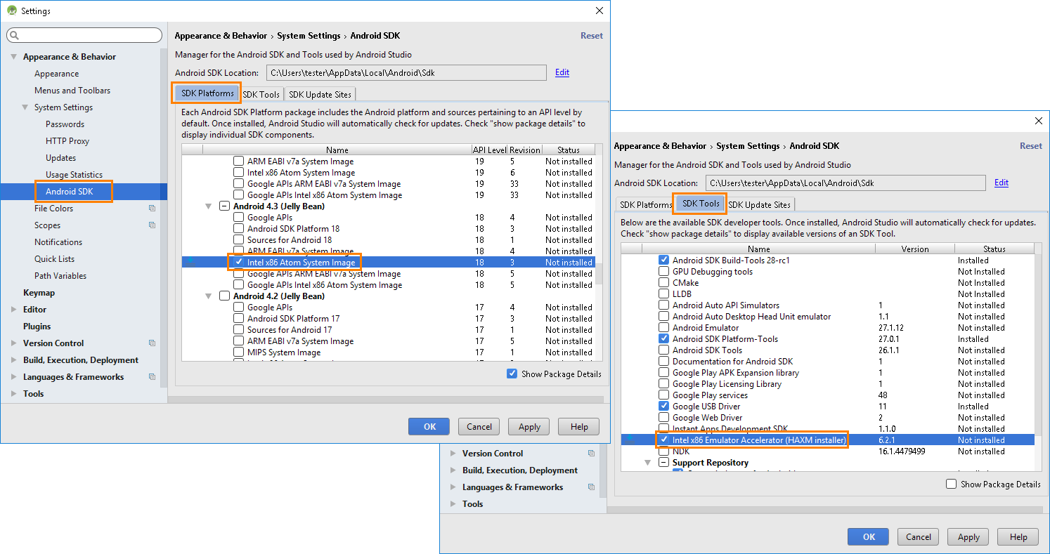 Note: | HAXM does not check for updates automatically. To update HAXM, download the new installation package using the SDK Manager and repeat the installation. |