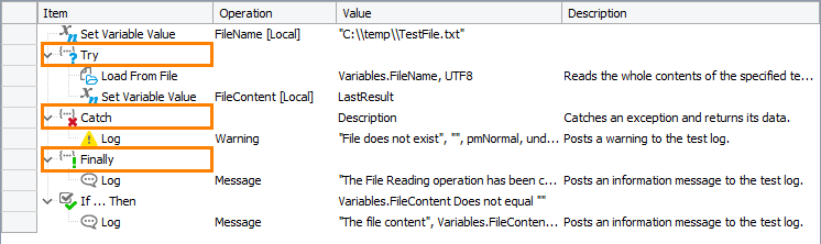 • The Catch operation contains operations that will be executed if an error occurs in the Try block. These operations can, for example, stop the test execution or send a notification to the tester.