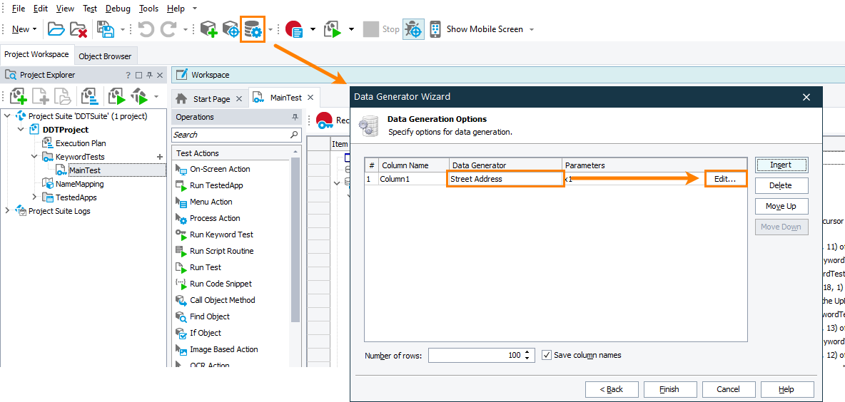 on the Tools toolbar or select Test > Generate Data from the main menu to call the Data Generator wizard. -