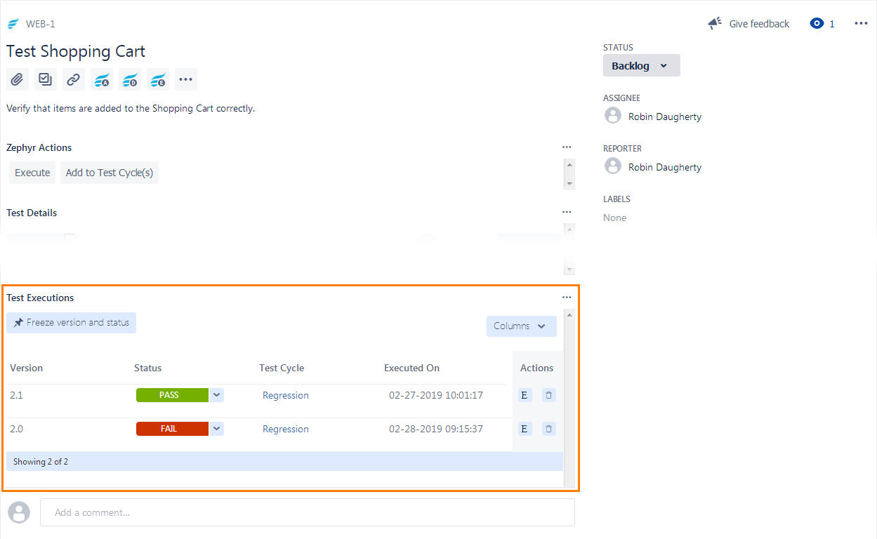 TestComplete sends the test status (Pass or Fail) to Jira and assigns it to the specified test case execution. You can view it in the Test Execution section of the test case in Jira: