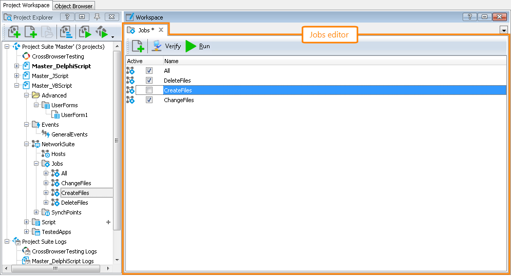 - Right-click the NetworkSuite | Jobs node in the Project Explorer and choose Edit from the context menu or simply double-click the NetworkSuite | Jobs node.
