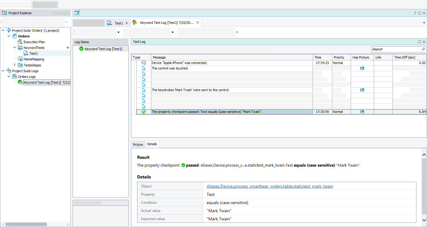 The Details panel contains details on the performed operation. For example, Details for property checkpoints includes the check type (equals, contains, matches a regular expression, and so on) and other details.