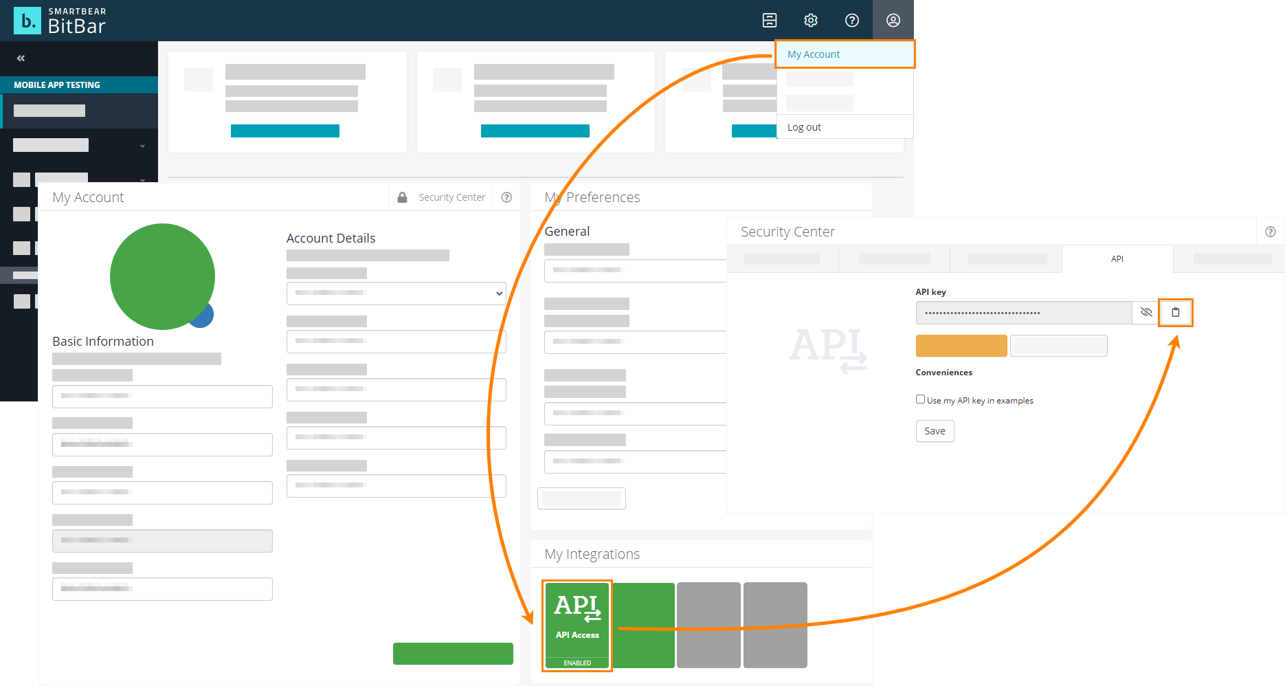 To access BitBar resources from TestComplete tests, the BitBar API Key is used. To get the key: