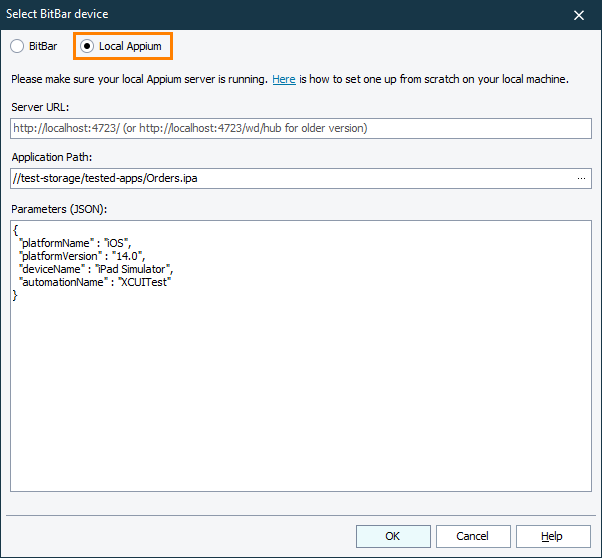 Specify the application path relatively to the Appium server location.In the Parameters editor, enter the capabilities that describe a testing session you want to open, in the JSON format. The dialog will validate the JSON code as you are typing.