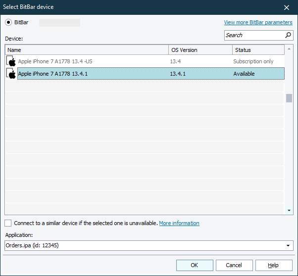 TestComplete shows the Select BitBar Device dialog. It lists all mobile devices that BitBar provides: